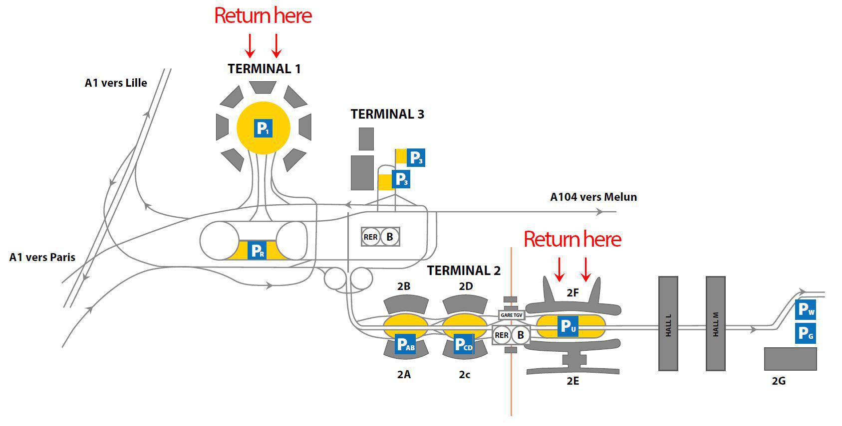 Terminal 1 prendre le véhicule aux arrivées porte 30 et de rendre les véhicules parking rouge zone loueurs,